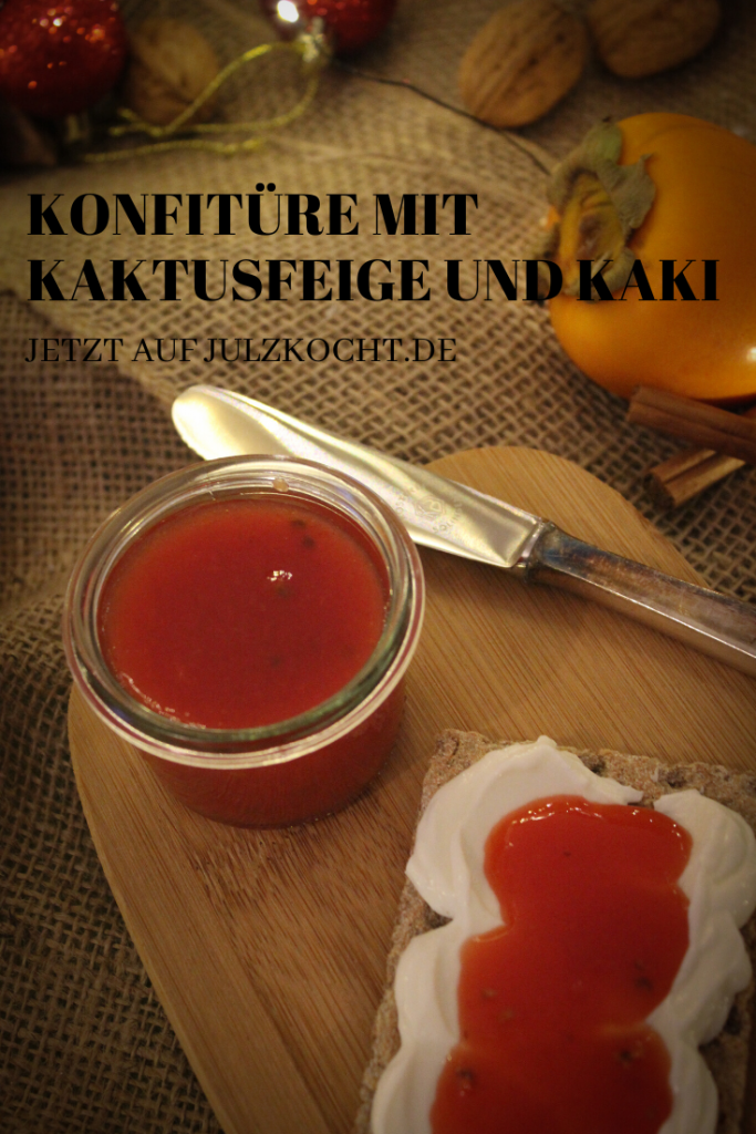 Die Konfitüre ist natürlich mit weihnachtlichen Aromen gespickt. Tonkabohne und Zimt sorgen dafür, dass man sie auch gut auf Kekse oder Stollen streichen kann. Es ist auch ein total schnelles Rezept. Einfach das Obst schälen. Alles zusammen aufkochen und pürieren. Fertig ist die Konfitüre aus Kaki und Kaktusfeige, welche sich auch richtig gut verschenken lässt.