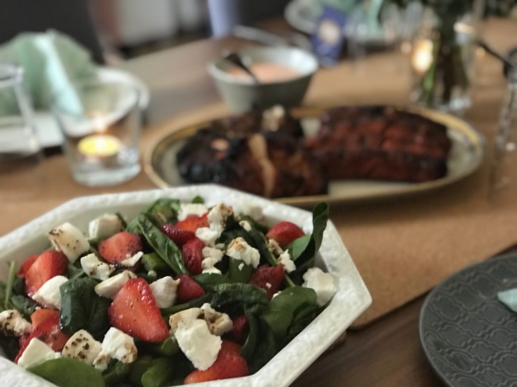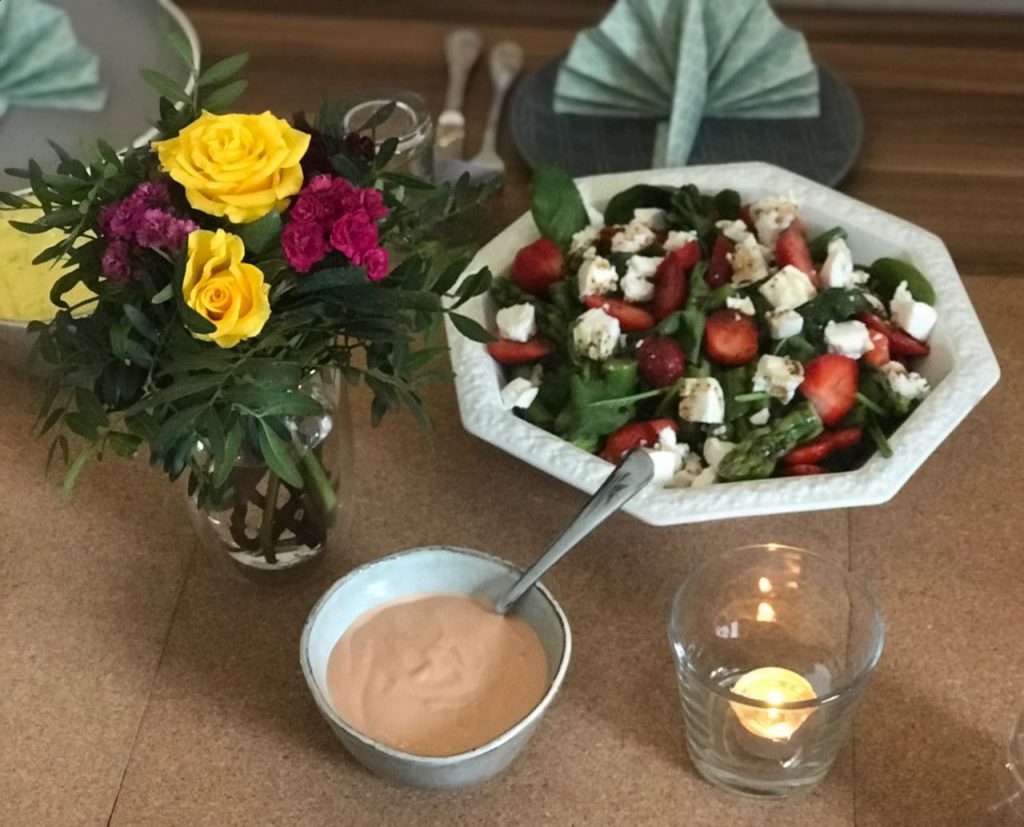 Was war das die letzten Tage für eine Hitze. Da kann einem doch echt manchmal der Appetit vergehen. Genau aus diesem Grund habe ich für heute ein leckeres und leichtes Rezept vorbereitet. Es gibt grünen Spargel auf Spinat mit Erdbeeren und Ziegenfrischkäse. Angerundet wird das Ganze mit einer leckeren Balsamico-Mohn-Vinaigrette. Meinen Gästen hat dieser Salat am Wochenende besonders gut geschmeckt. Probiert ihn doch am besten gleich mal aus. Spargel und Erdbeeren kann man schließlich nie genug essen.