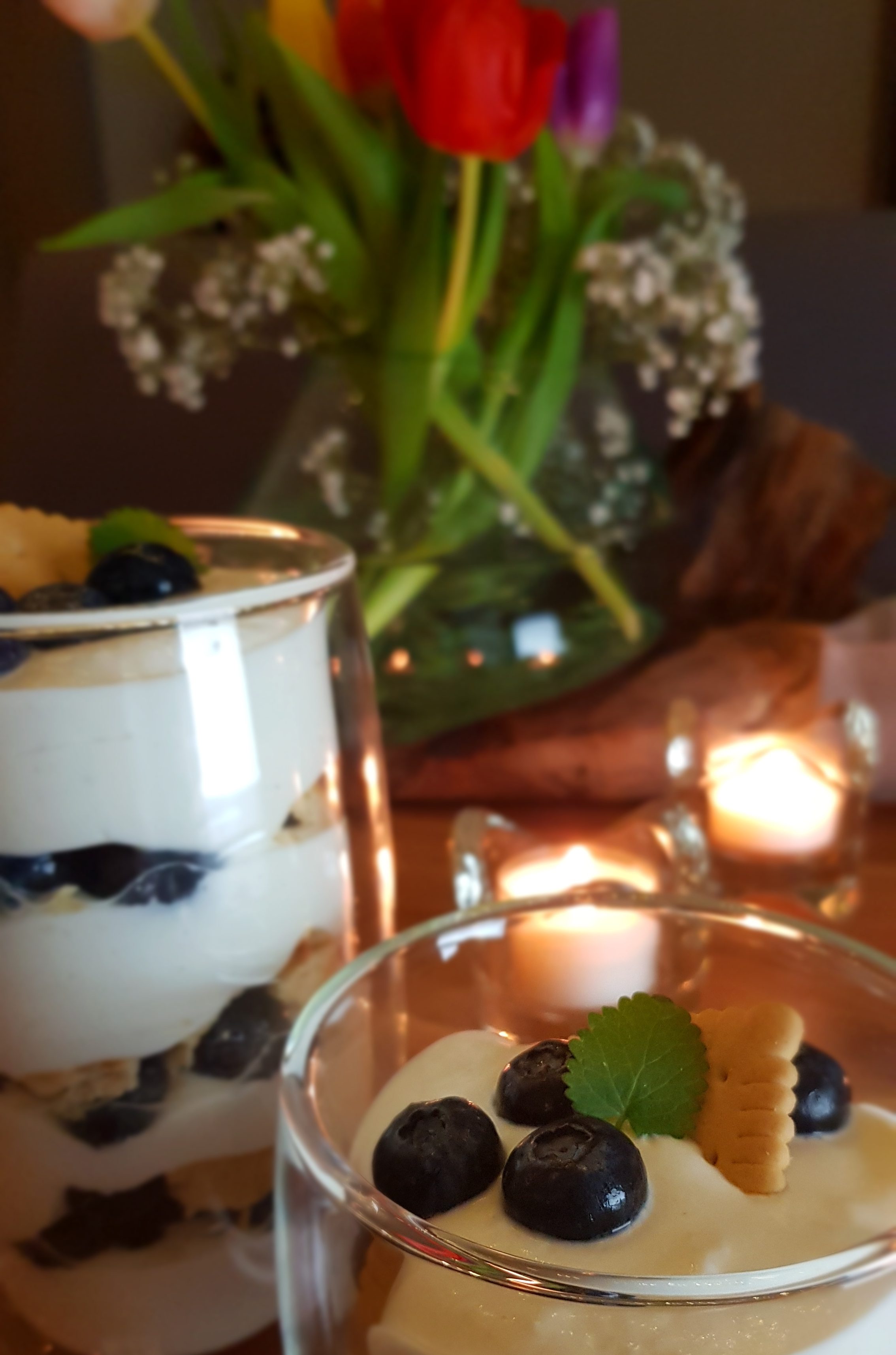 Frischkäsecreme, Butterkeks und Blaubeeren. Ein erfrischend leichtes Dessert.