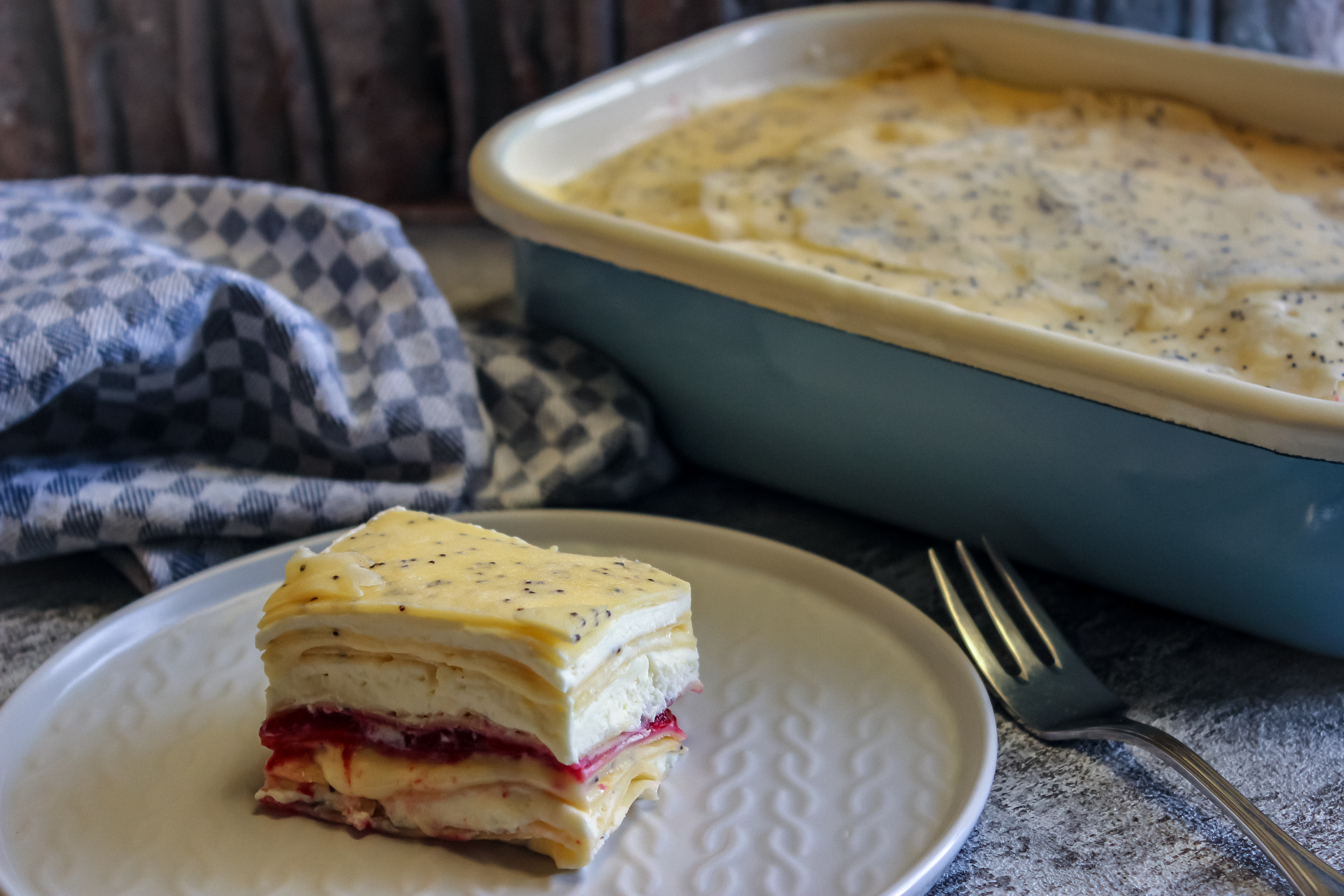 Eine süße Lasagne aus Crêpes, weißer Schokolade und Cranberries.
