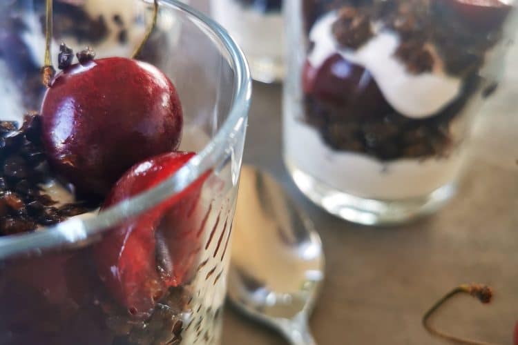 - Sobald die Pumpernickelbrösel erkaltet sind können alle Komponenten in Gläsern geschichtet werden. Abschließend werden die Schokoladensplitter auf die westfälische Quarkspeise gegeben und die Gläser mit Kirschen und Minze dekoriert.